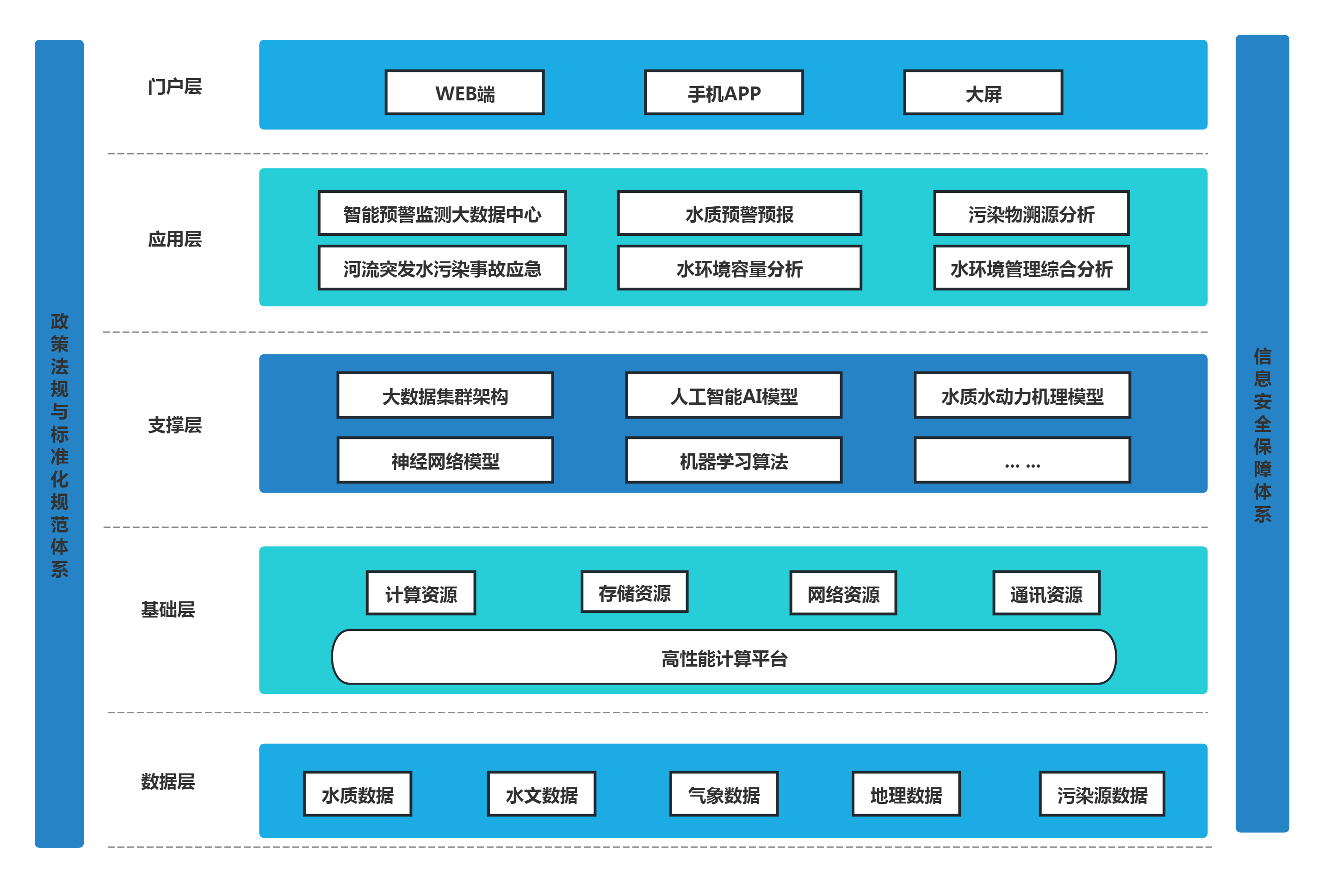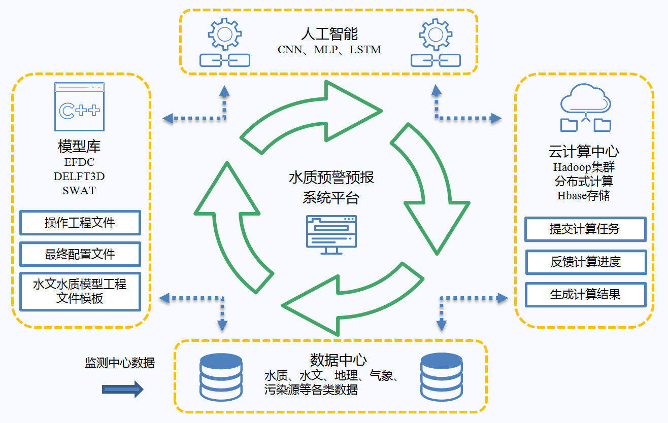 数据中心严格遵循国家生态环境部标准规范,基于大数据集群架构与分布式计算技术,融合人工智能分析模型,集成水生态环境监测、统计管理及可视化分析功能,构建集数据采集存储、统计分析、业务管理、挖掘应用与智能展示于一体的综合管理平台,实现水生态环境数据的全流程智能化治理与科学决策支持。