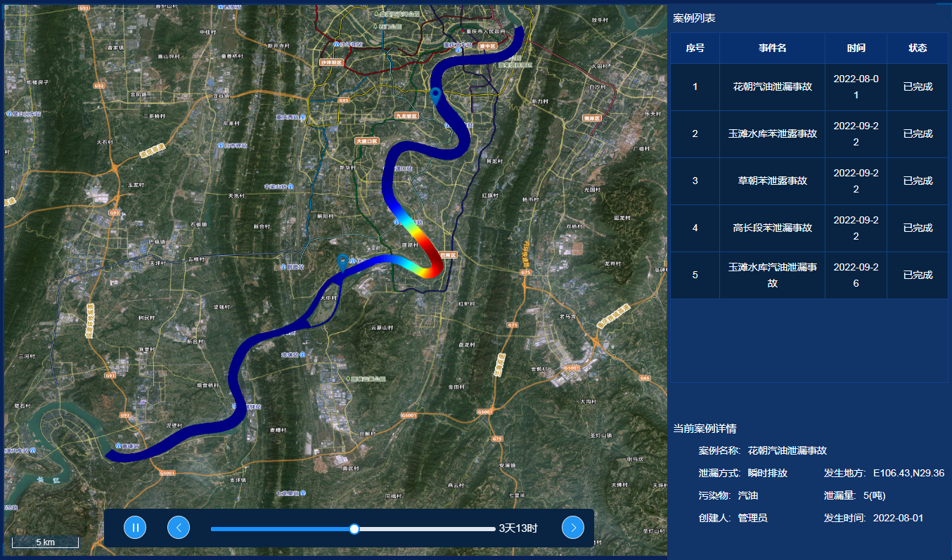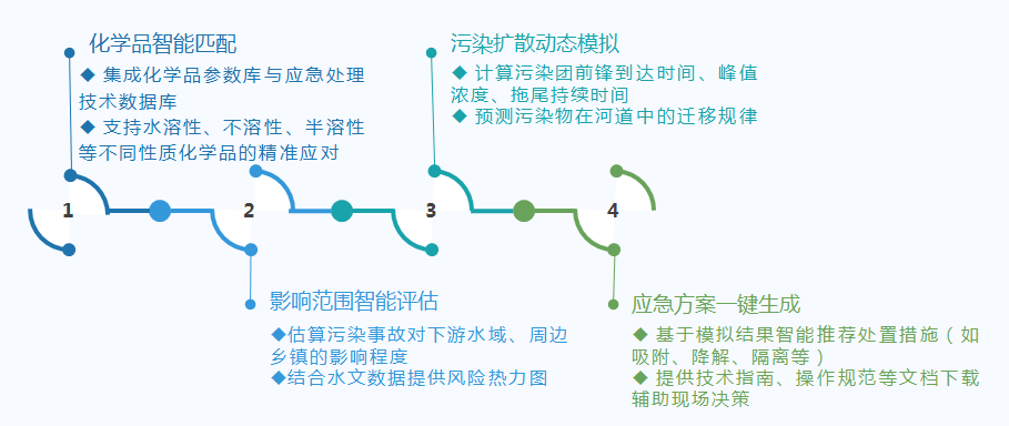 基于模拟预测技术,系统可分析污染物在水体中的迁移转化规律及其时空分布特征,实现水体污染风险场的快速评估。同时,通过结合智能化处置工具包,根据风险等级和环境条件,动态生成最优应急处置方案,显著提升应急响应效率。