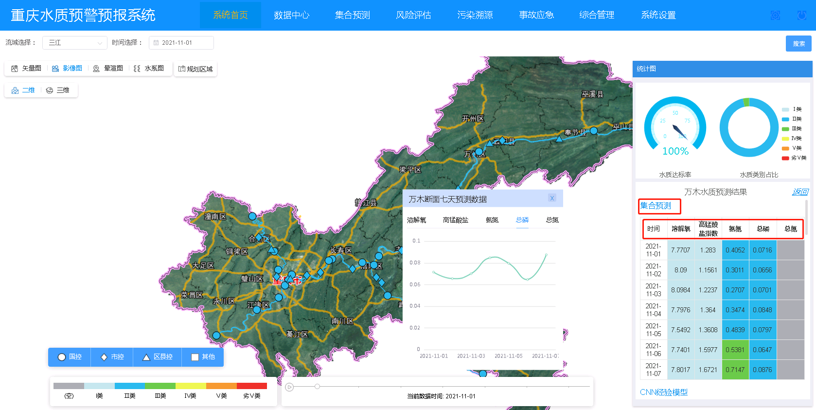 模拟系统集成六类机理模型,通过机器学习技术实现双重预报优化:(1)对气象、水文等机理模型驱动数据的时间序列进行机器学习预报,作为机理模型的动态输入;(2)针对考核断面水质,采用机器学习算法生成独立预报结果,并与机理模型预报结果进行集合预报,提升预测精度。